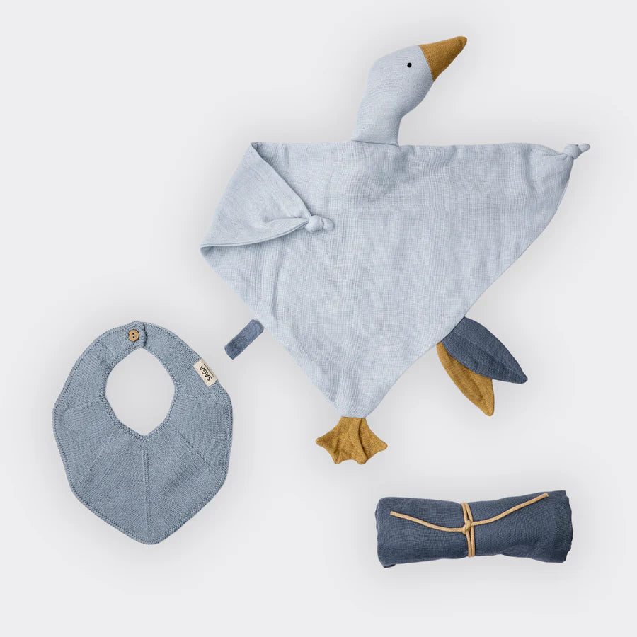 A caixa de presente inclui: Pano para fraldas - Azul claro - 70 x 70 cm Pano para aconchegar - Azul claro - 44 x 46 cm Babete de malha - Azul claro - 19 x 25 cm